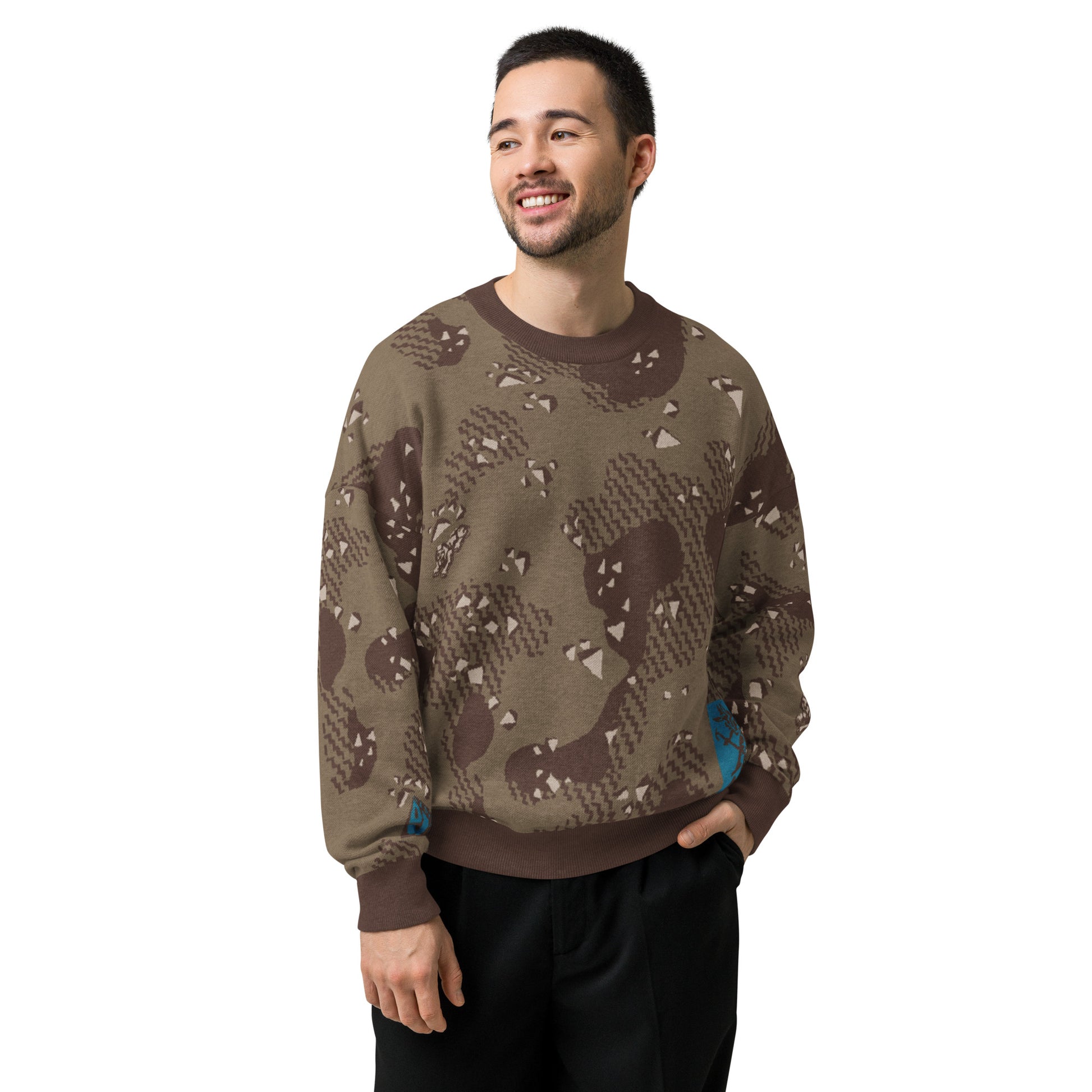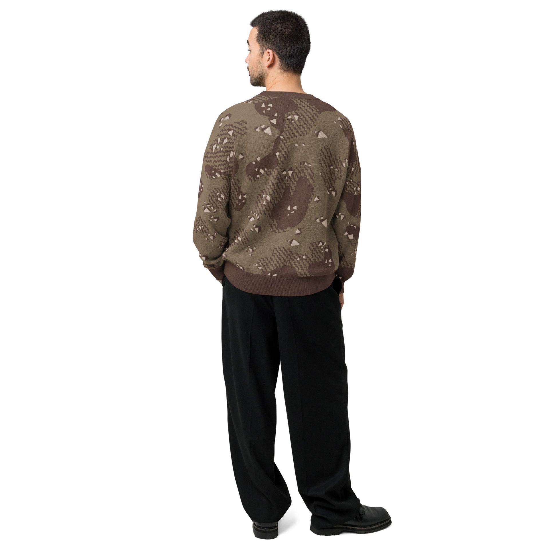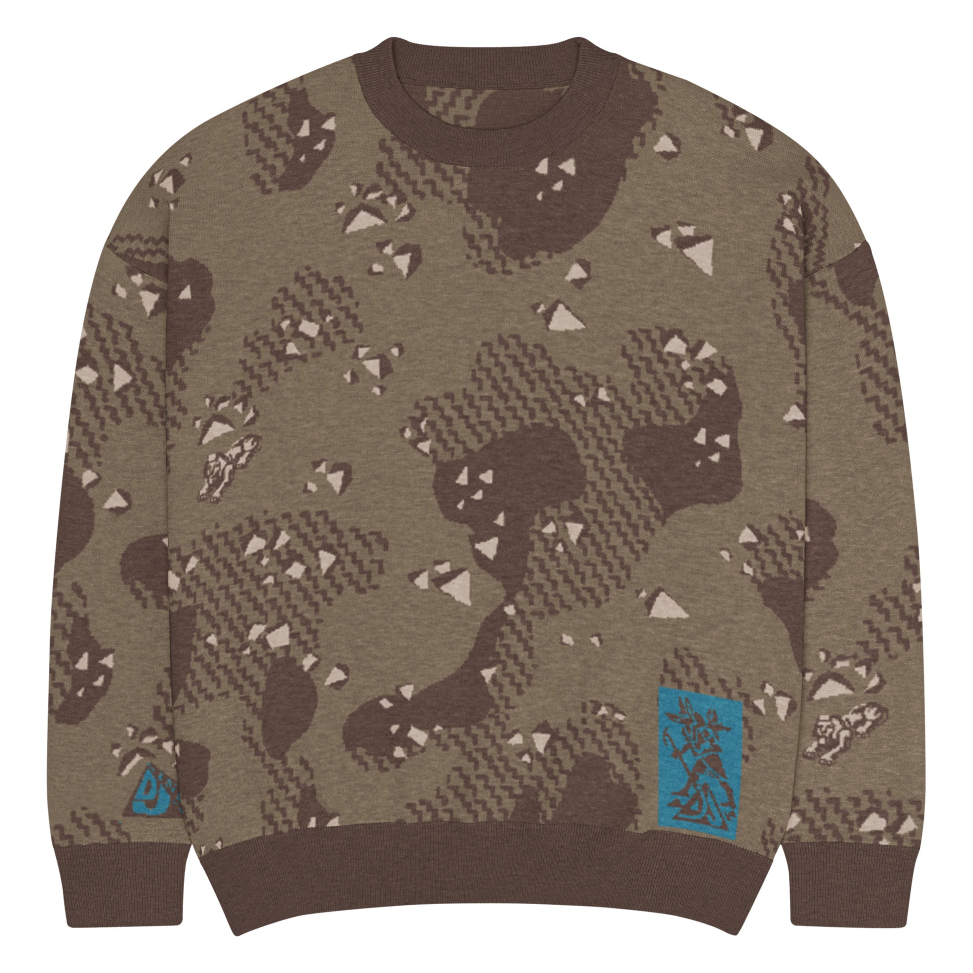 Roomier fit knit sweater with Dark Desert Chip camo pattern and Anubis Totem detail.